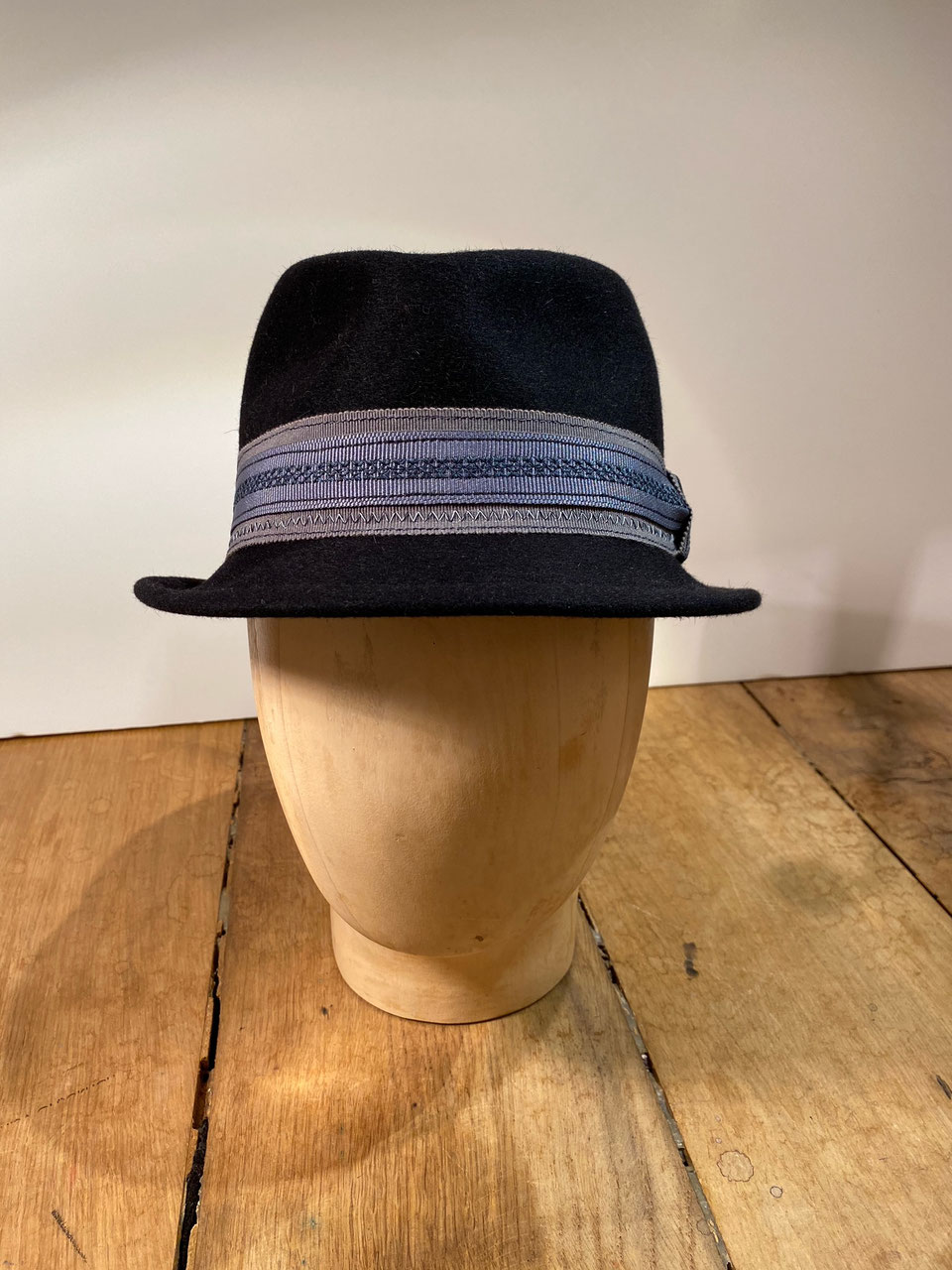 Diesen Hut habe ich aus feinstem Haarfilz handgezogen. Die Krempe ist hinten aufgeschlagen. Der Rand des Hutes ist mit einem dunkelblauen Ripsband eingefasst. Passend zum Einfass habe ich ein klassisches Ripsband als Garnitur verwendet. Ein Unisexmodell für Jedermensch, der auf Klassiker steht.