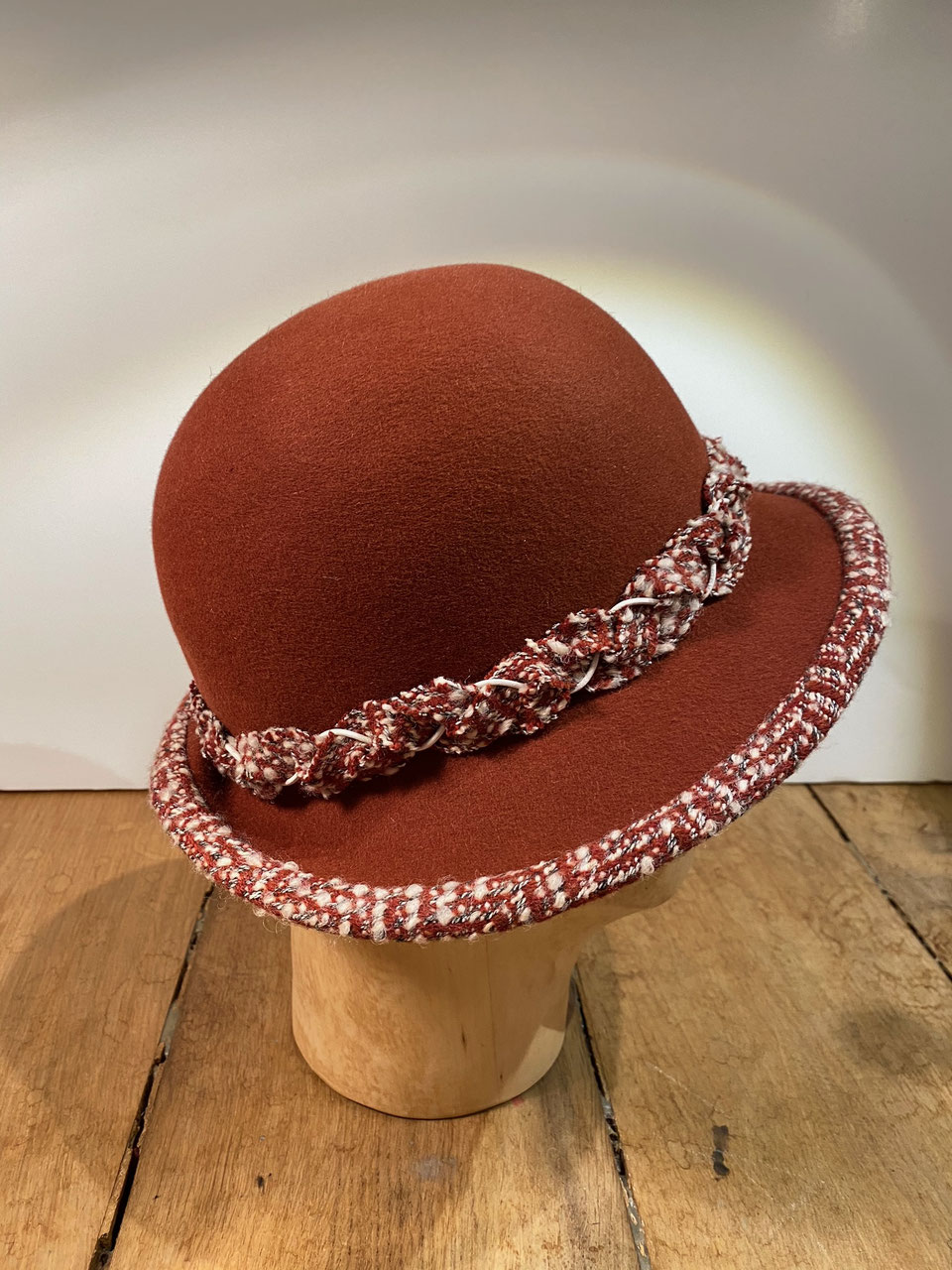 Diesen Hut in einem warmen Ziegelton habe ich aus feinstem Haarfilz handgezogen. Man nennt diese Hutform Schute. Im Nacken habe ich den Hut sehr kurz gehalten, so hast du keine Probleme das dein Schal oder Kragen den Hut hochschiebt, obwohl er eine etwas ausladendere Krempe hat (ca.6cm breit). Garniert ist der Hut mit einem geflochtenem Band, der den Einfass des Hutes wieder aufgreift. So ergibt sich ein sehr harmonisches Bild.