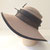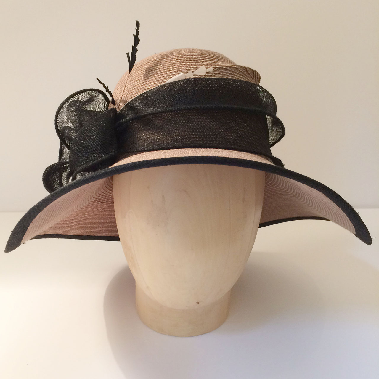Der Grundton ist ein warmes taupe, Einfass und Garnitur sind aus Sinamay, einem Gewebe aus Agavenfasern, in schwarz. Der Abschluss der Garnitur ist durch handgeschnittene Federn in schwarz und weiß aufgelockert.