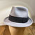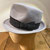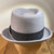 Klassischer lichtgrauer Fedora mit schmalem Rand.