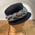 Diesen Hut habe ich aus feinstem Haarfilz handgezogen. Die Krempe ist rundum kurz gehalten. Das Garniturband besteht aus zwei übereinanderliegenden Bändern in unterschiedlichen Grautönen. Ein Unisexmodell für Jedermensch.